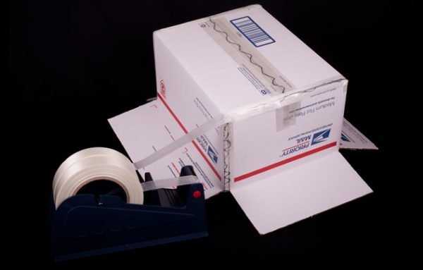 The Post Office requires paper tape so that the ink will absorb. Ink will rub right off filament tape, and that is why the filament tape must be covered with 3″ brown paper tape.