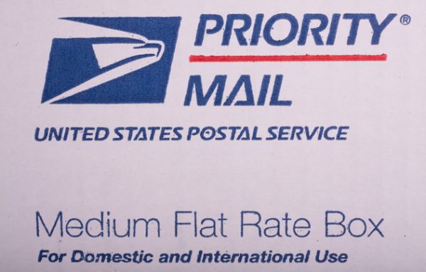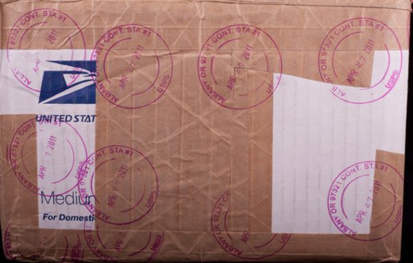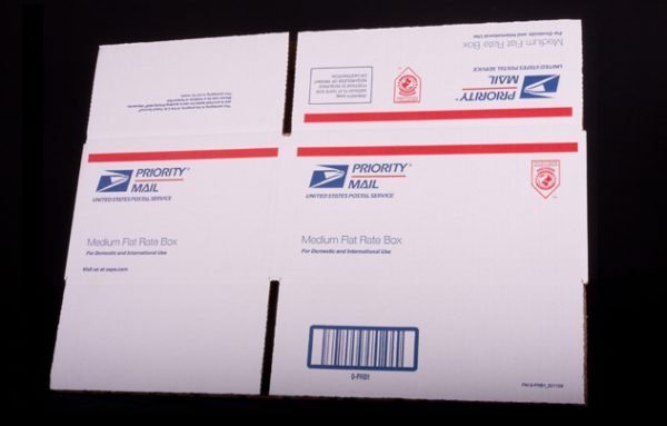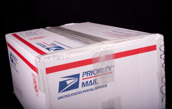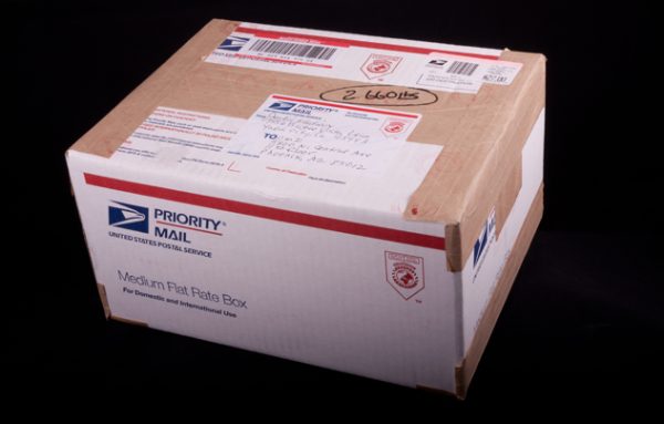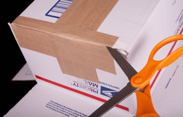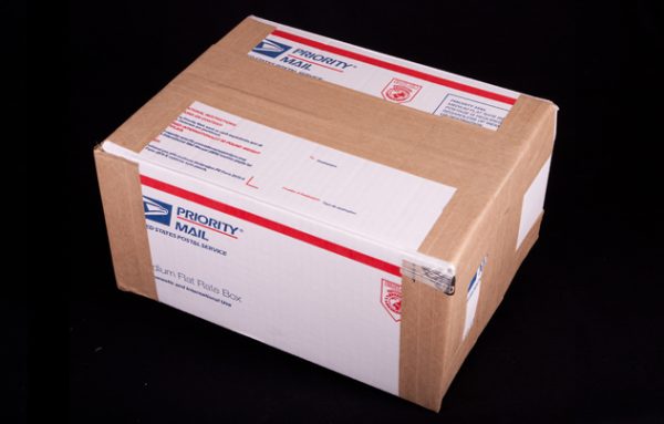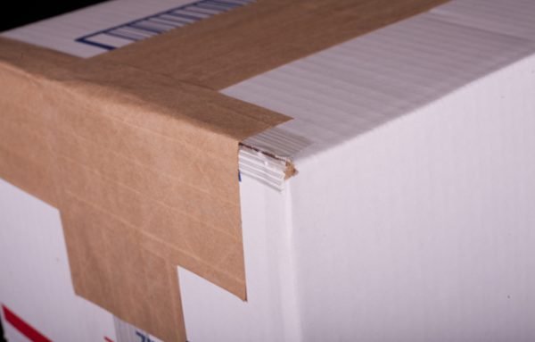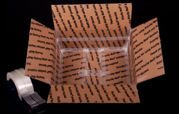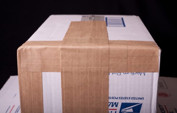 3″ brown tape must be put over the filament tape so that the Post Office clerks can postmark the package. This is done for tamper proofing the package.