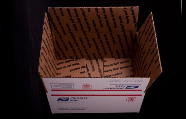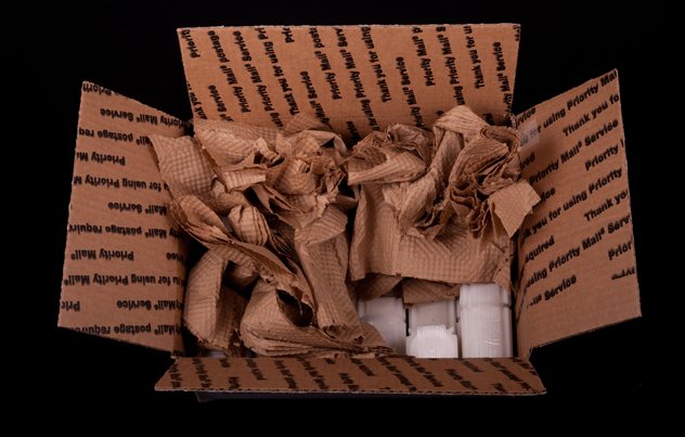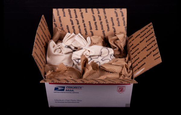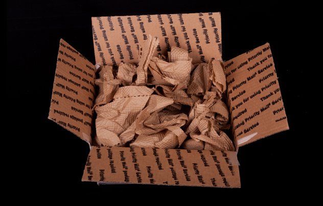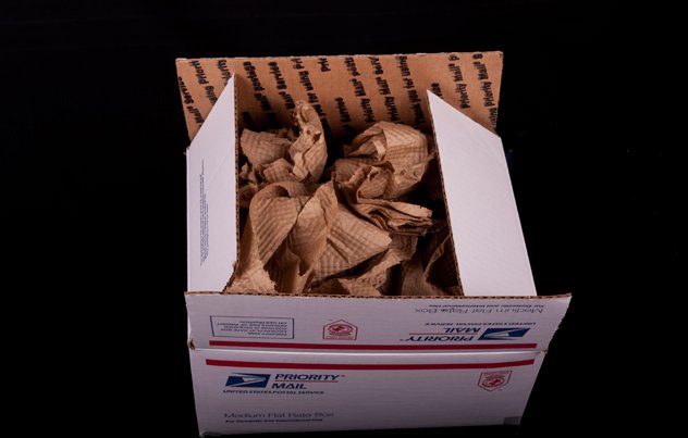 Crunched up newspapers make great filling for the box. Do not use shredded paper or Styrofoam “peanuts.” Use old newspapers. Styrofoam peanuts and shredded paper result in nightmares when the packages are opened.