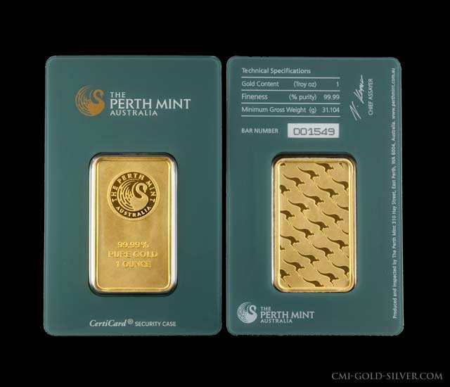 PAMP, known for their impeccable designs and high-quality standards, used to dominate the one-ounce gold bar market, is a competitor with Perth Mint 1-oz gold bars. PAMP and Perth Mint gold bars are .9 99 fine (99.99% pure) and sold in cases of twenty-five bars. Each bar is encased in Mylar and includes a certificate of authenticity.