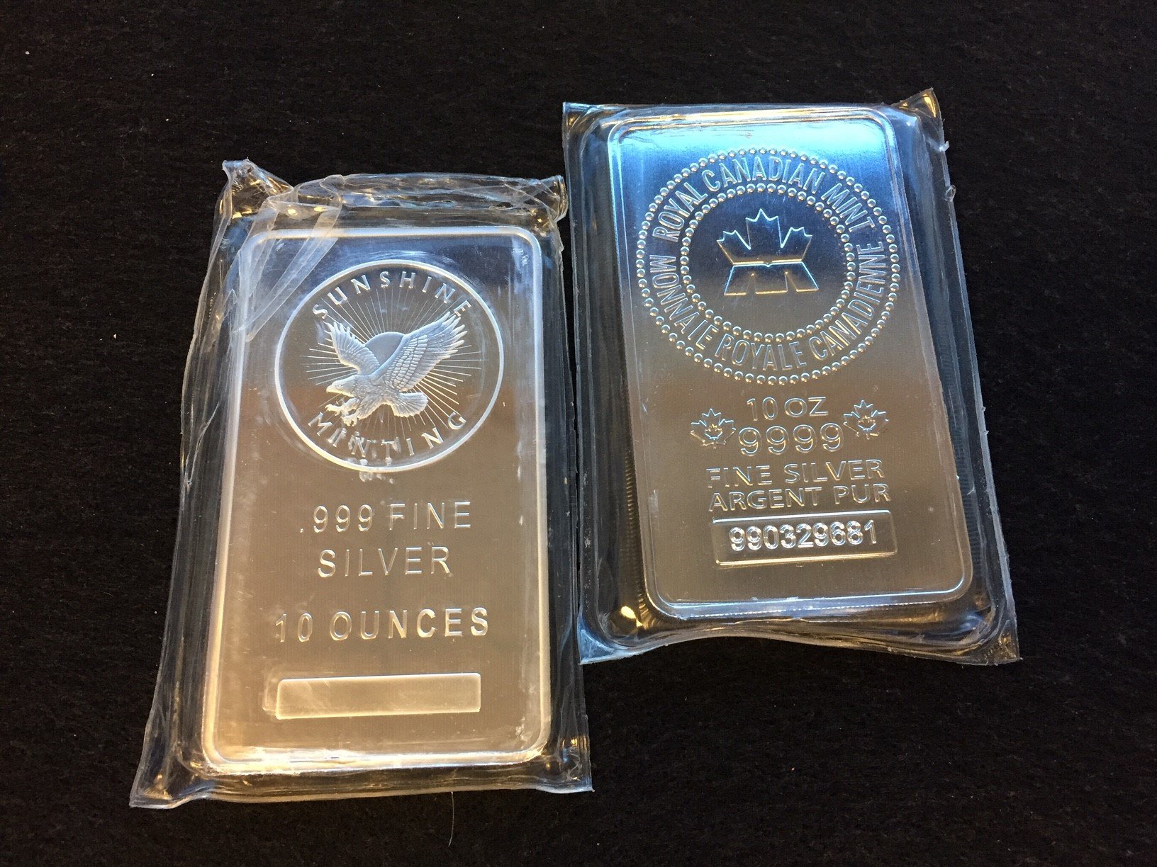 RCM and Sunshine Minting .999 fine 10-oz. silver bullion bars are easily the most popular 10-oz. silver products available. They are packaged in protective Mylar coverings.