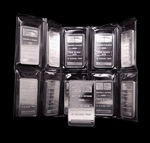 Being flat and uniform, 10-oz. silver bars stack and store neatly. Oddly, 10-oz. silver bars cost a few pennies more than 1-oz. silver rounds.